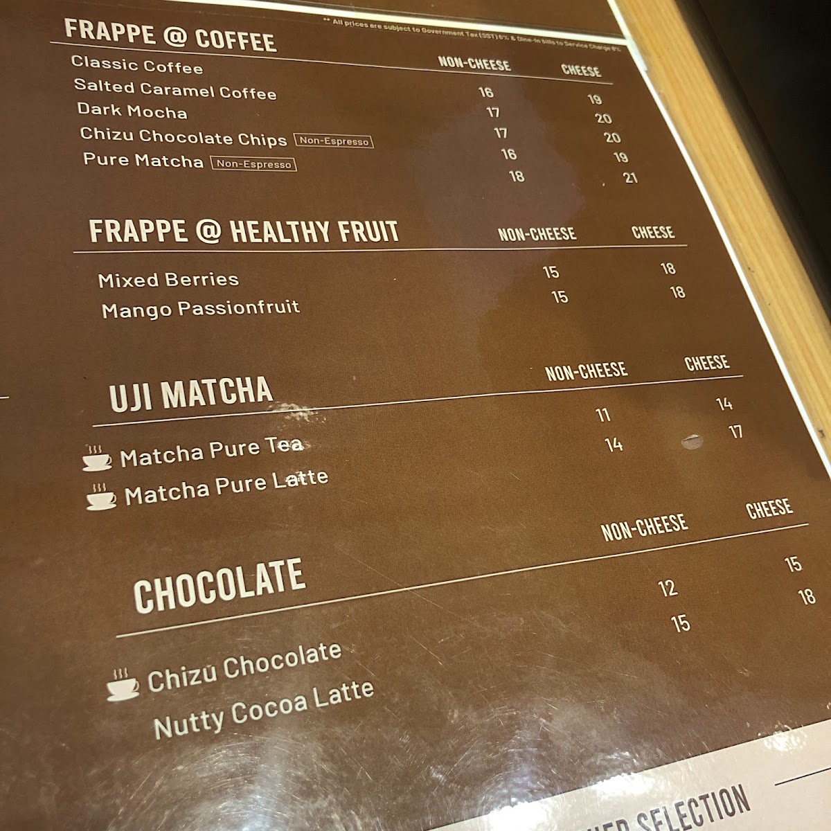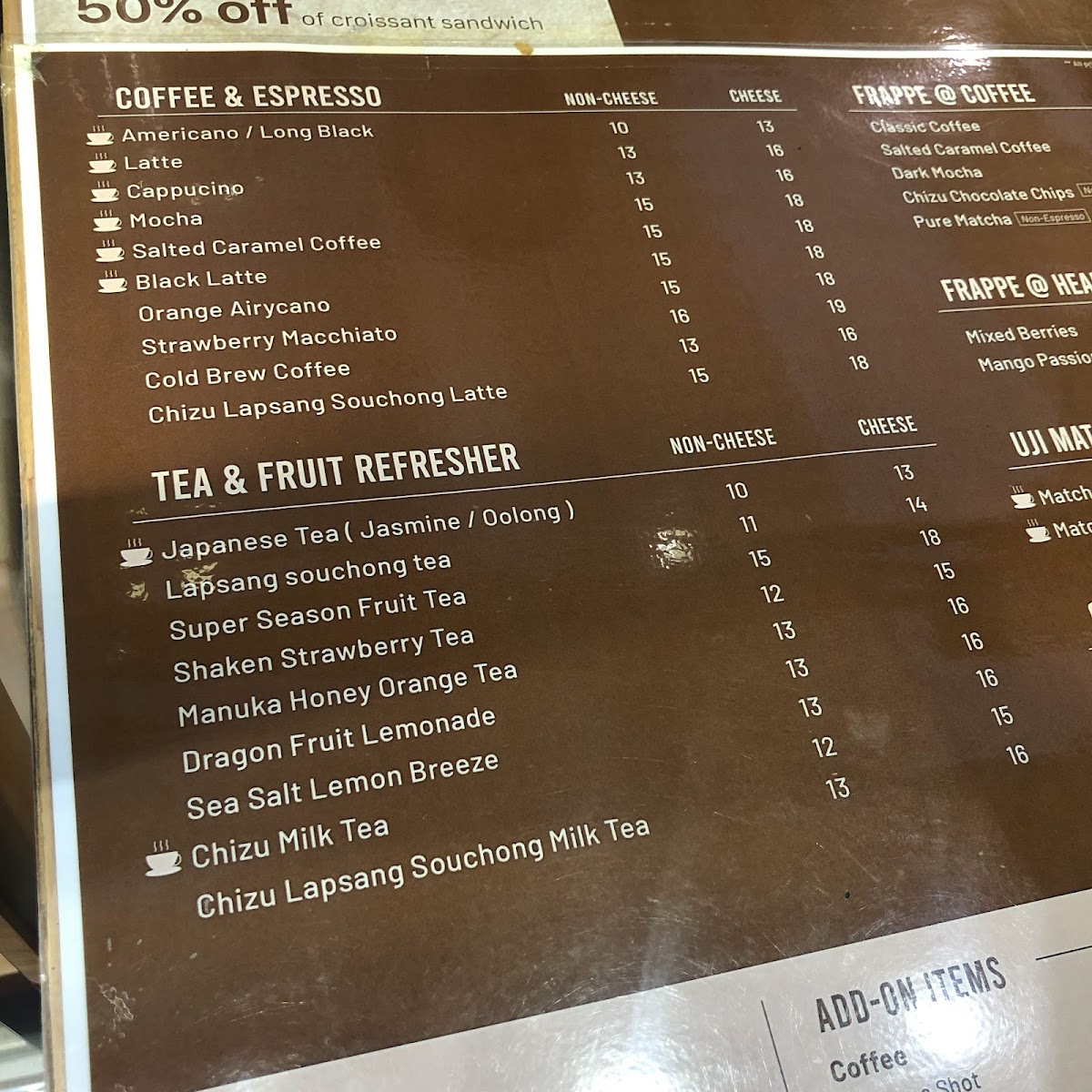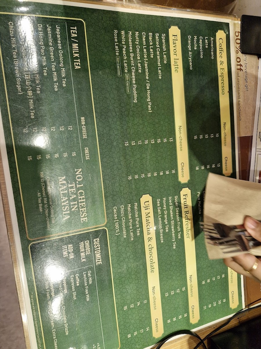 - Beverages: Coffee selections including cappuccino, latte, and specialty coffees, together with a variety of tea options featuring unique cheese foam toppings.